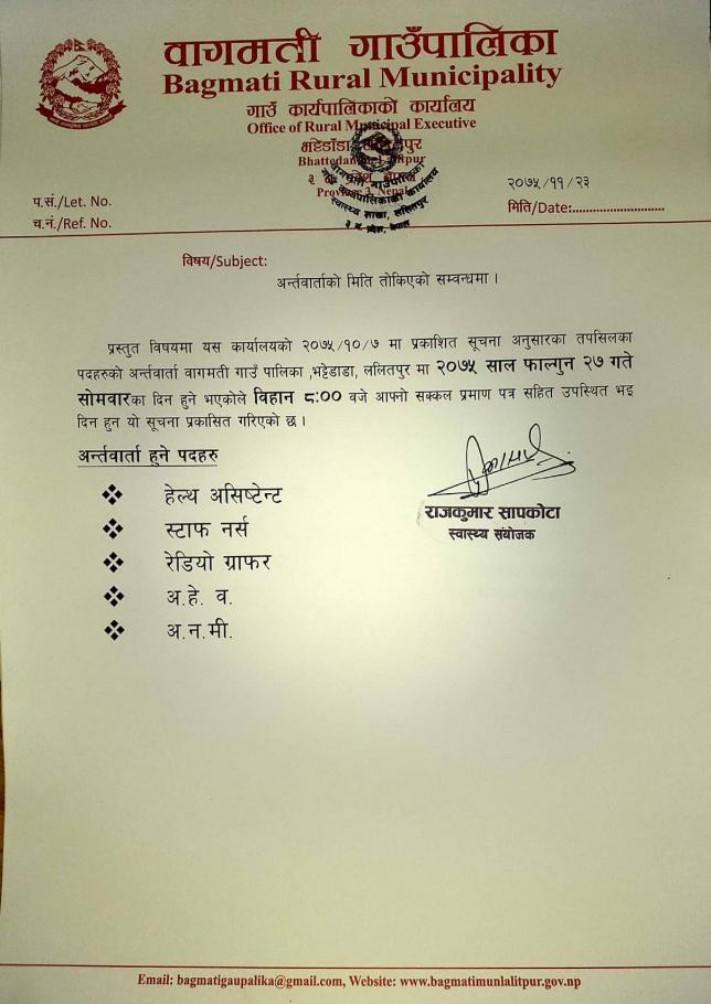 प्रस्तुत विषयमा यस कार्यालयको २०७५/१०/०७ मा प्रकाशित सूचना अनुसारका तपसिलका पदहरुको अर्न्तवार्ता बागमती गाउँपालिका भट्टेडाँडा ललितपुरमा २०७५ साल फाल्गुण २७ गते साेमबारका दिन हुने भएकाेले विहान ८:०० बजे अाफ्नाे सक्कल प्रमाणपत्र सहित उपस्थित भइ दिनहुन यो सूचना प्रकाशित गरिएको छ ।