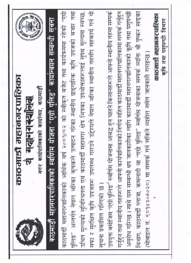 » काठमाडौँ महानगरपालिकाको स्वर्णिम योजना "एग्रो पुलिङ" कार्यान्वयन सम्बन्धी सूचना