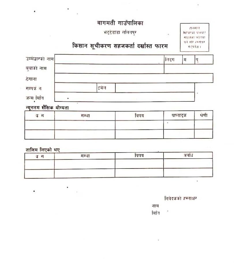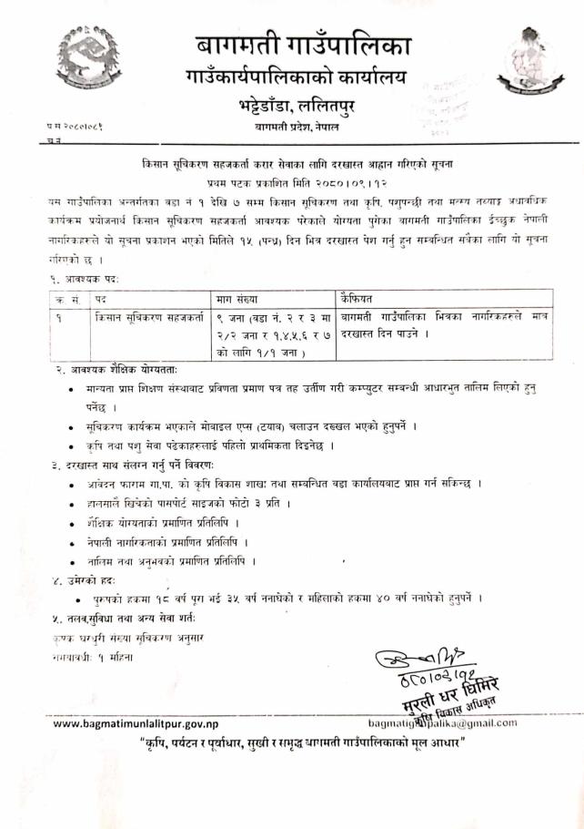 किसान सूचिकरण सहजकर्ता करार सेवाका लागि दरखास्त आव्हान गरिएको सूचना