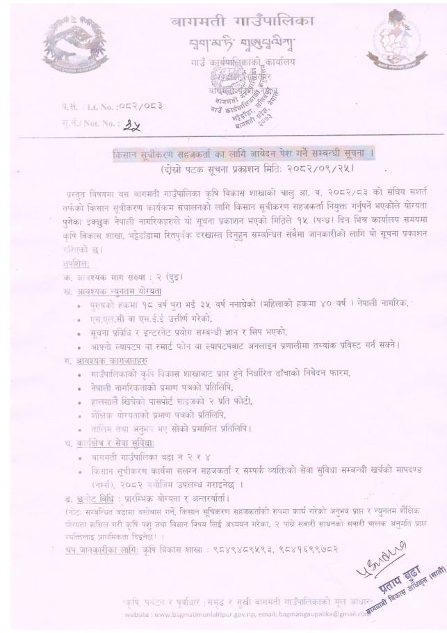 किसान सूचीकरण सहजकर्ताका लागि आवेदन पेश गर्ने सम्बन्धी सूचना
