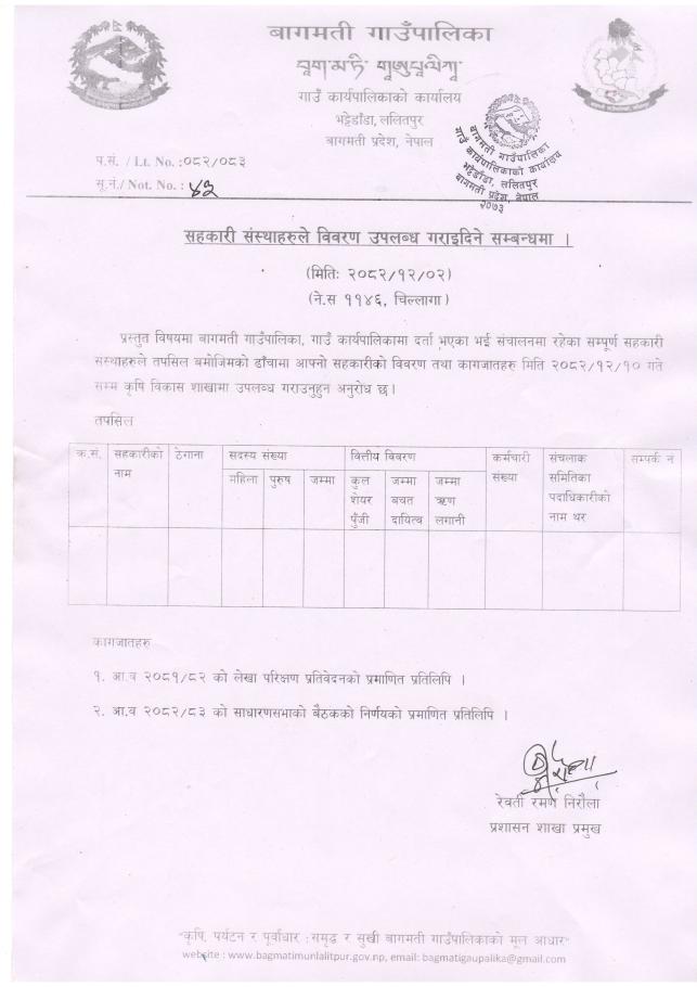 » बागमती गाउँपालिका भित्रका सहकारी संस्थाहरुले विवरण उपलब्ध गराइदिने सम्बन्धमा ।