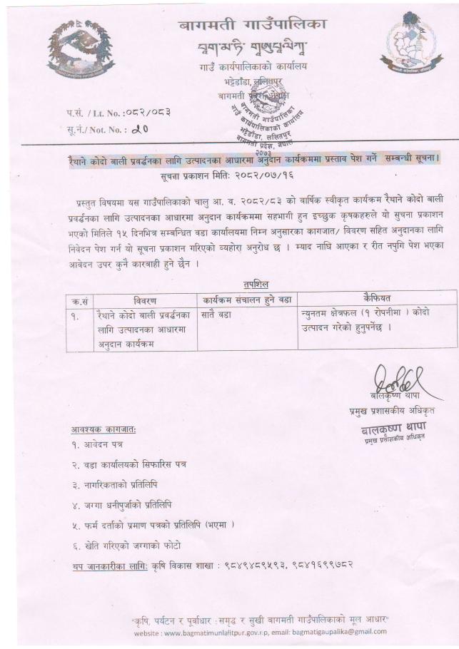 रैथाने कोदो बाली प्रवर्द्धन लागि उत्पादनका आधारमा अनुदान कार्यक्रममा प्रस्ताव पेश गर्ने सम्बन्धी सूचना ।