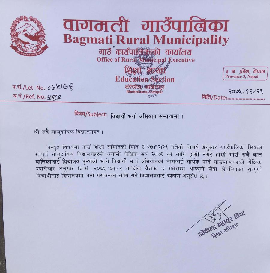 प्रस्तुत विषयमा गाउँ शिक्षा समितिको मिति २०७५/१२/२९ गतेको निर्णय अनुसार गाउँपालिका भित्रका सम्पूर्ण सामुदायिक विद्यालयहरुले आगामी शैक्षिक सत्र २०७६ को लागि "हाम्रो नगर हाम्रो गाउँ सबै बाल बालिकालाई विद्यालय पुर्याऔँ" भन्ने विद्यार्थी भर्ना अभियानको नारालाई सार्थक पार्न गाउँपालिकाको शैक्षिक क्यालेण्डर अनुसार वि.सं. २०७६/०१/०२ गतेदेखि बैशाख ६ गतेसम्म आफ्नो सेवा क्षेत्रभित्रका सम्पूर्ण विद्यार्थीलाई विद्यालयमा भर्ना गराउनका लागि सबै विद्यालयलाई व्यहाेरा अनुरोध छ ।