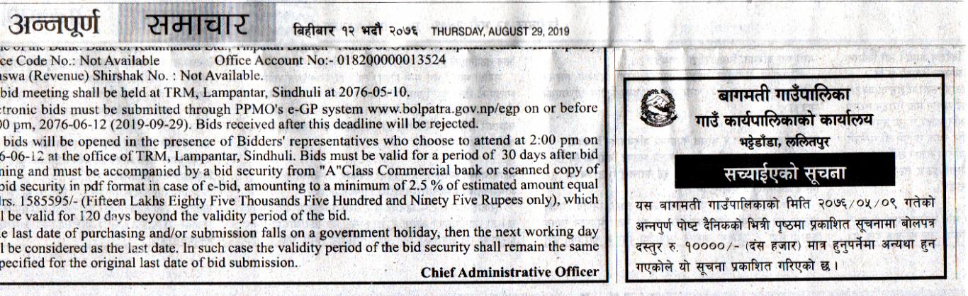 यस बागमती गाउँपालिकाको मिति २०७६/०५/०९ गतेको अन्नपूर्ण पोष्ट दैनिकको भित्री पृष्ठमा प्रकाशित सूचनामा बोलपत्र दस्तुर रु १००००/- दश हजार मात्र हुनुपर्नेमा अन्यथा हुन गएकोले यो सूचना प्रकाशित गरिएको छ ।
