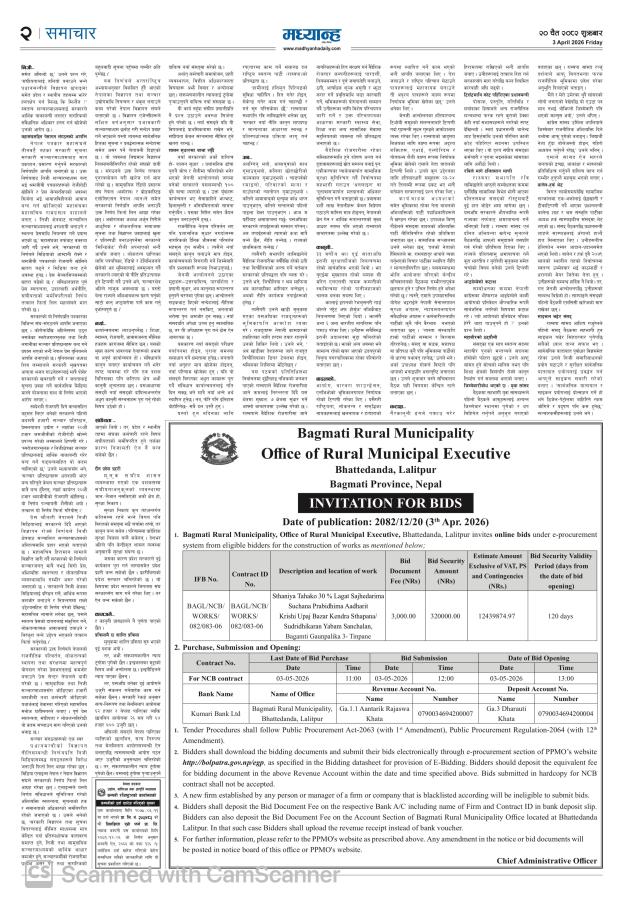 » Invitation for bids BAGL/NCB/WORKS/082/083-06 Sthaniya Tahako 30% Lagat Sajhedarima Suchana Prabidhima Aasharit Krishi Upaj Bazar Kendra Sthapana/ Sudridhikaran Yabam Sanchalan, Bagmati Gaunpalika 3- Tinpane