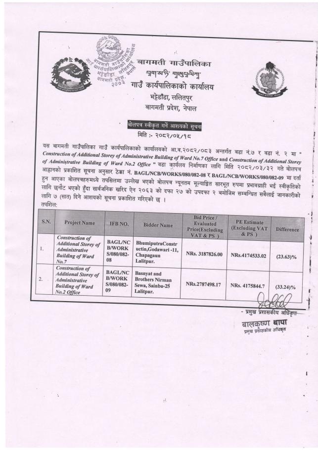 बोलपत्र स्वीकृत गर्ने आशयको सूचना "Naya Gaun Maire Khanepane yojana ward no.3 (BAGL/NCB/WORKS/081/082-05)