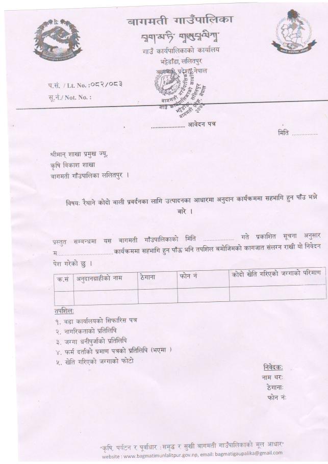 रैथाने कोदो बाली प्रवर्द्धन लागि उत्पादनका आधारमा अनुदान कार्यक्रममा प्रस्ताव पेश गर्ने सम्बन्धी सूचना ।